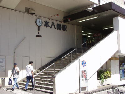 | JR本八幡駅南口階段。 時計とともに、駅名表示がある。 画像 de5468 撮影時刻 2002/08/31 12:23:03 |
