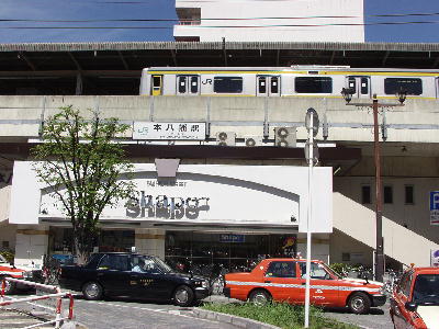 | JR本八幡駅南口。 こちらはShapoの入口にもなっている。 高架上に209系500番台が見える。 画像 de5470 撮影時刻 2002/08/31 12:25:38 |