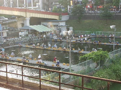 | JR市ヶ谷駅ホームから観た釣り堀。 市ヶ谷橋の下の外堀に設置されている。 画像 de5500 撮影時刻 2002/08/31 17:03:11 |