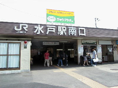 | リニューアル前のJR水戸駅南口。 貨物線の線路が数多く走っているため、 南口は長い跨線橋の先に、 2階広場上に設置された。 画像 de8602 撮影時刻 2003/07/26 13:37:27 |