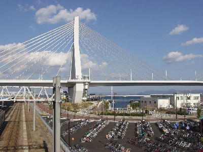 | 青森駅から見える青森ベイブリッジ。 海岸沿いを走る道が、 青森駅を跨ぐために造られた橋で、 展望台も造られている。 画像 de2187 撮影時刻 2001/11/23 13:11:35 |