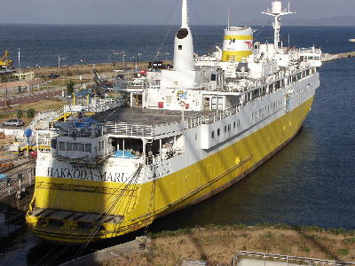 | 青函連絡船「八甲田丸」。 かくて青函連絡船として使われていた船で、 現在も保存され、船内も公開されている。 煙突には“国鉄”のマークが残っている。 画像 de2196 撮影時刻 2001/11/23 13:28:52 |