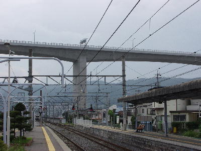 | 岡谷駅ホームから見た長野自動車道。 中央道から岡谷JCTで別れ、 長野自動車道は岡谷トンネルを抜けて、 岡谷ICに至る。 画像 de5304 撮影時刻 2002/08/04 16:40:02 |