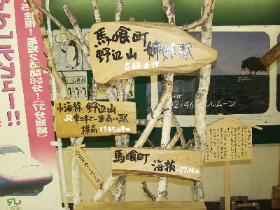 | 駅にある野辺山との姉妹駅に関する展示。 小海線野辺山駅は標高1345.67m、 馬喰町駅は海抜-27.14mと書かれている。 画像 de6336 撮影時刻 2002/12/14 11:25:10 |