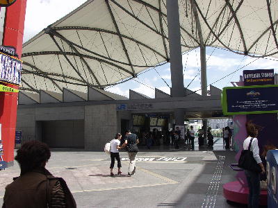 | ユニバーサルシティ駅全景。 鳥が翼を広げたような屋根が特徴的。 USJのイメージを損なわないように、 駅のデザインも工夫されている。 画像 de1707 撮影時刻 2001/09/09 12:48:42 |